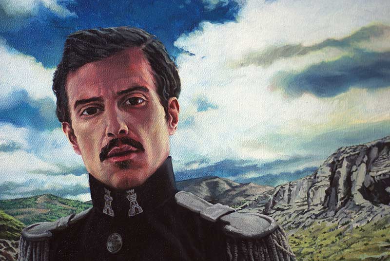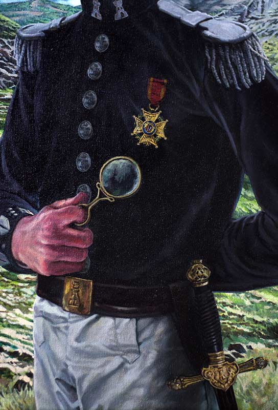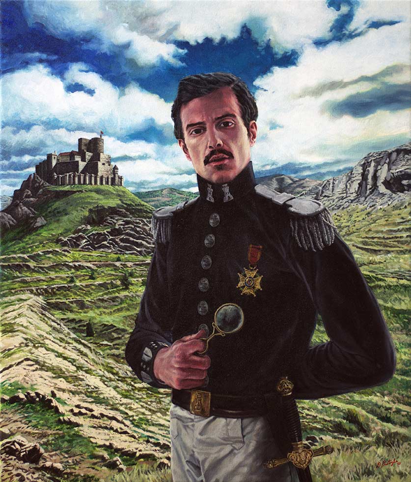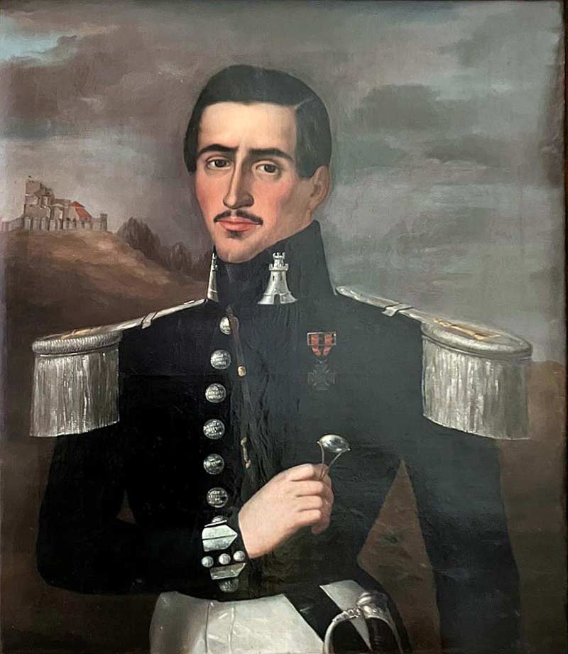 Retrato histórico de Tomás Clavijo y Pló (Santa Cruz de Tenerife, diciembre de 1814 – Aliaga, Teruel, 15 de abril de 1840). Militar, Capitán de Ingenieros. Murió en el Sitio de Aliaga al aplicar una mina a la escarpa del citado fuerte (abierta bajo intenso fuego enemigo), que explosionó de forma prematura. Por su extraordinario comportamiento, le fue concedida la Cruz de San Fernando a título póstumo.